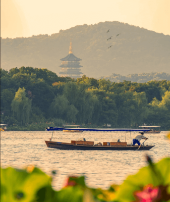 - Du thuyền ngắm cảnh Tây Hồ– được xem là đẹp và nên thơ nhất trong hơn 36 hồ có cùng tên ở Trung Quốc, ngắm Quả sơn, Đoạn kiều, Trường kiều, Tô Đê, Bạch Đê, Tam Đàn Ấn Nguyệt và Hoa Cảng Quan Ngư (bên ngoài) gắn liền với những truyền thuyết về Lương Sơn Bá – Chúc Anh Đài, Thanh xà – Bạch xà, và các tác phẩm của nhà thơ Lý Bạch.